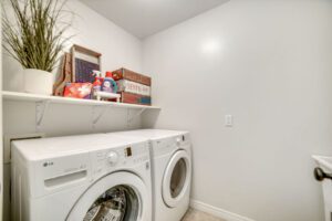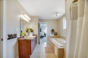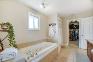 Upstairs, you’ll find a luxurious primary suite complete with a walk-in closet and a large ensuite bath featuring a separate soaker tub, walk-in shower, vanity with sink, and a private water closet. Two additional generously sized bedrooms—one with a vaulted ceiling—share a thoughtfully designed main bath with separate vanity and bathing areas for added convenience.