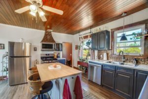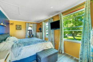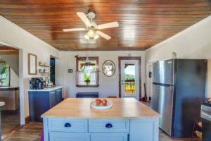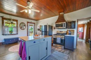 Recent upgrades include vinyl siding, new windows and doors, an updated kitchen with a central island, a durable metal roof, and a luxury vinyl plank flooring. The property also benefits from a modernized bathroom, a 3,000-gallon cistern (2024), and updated eaves (2024).