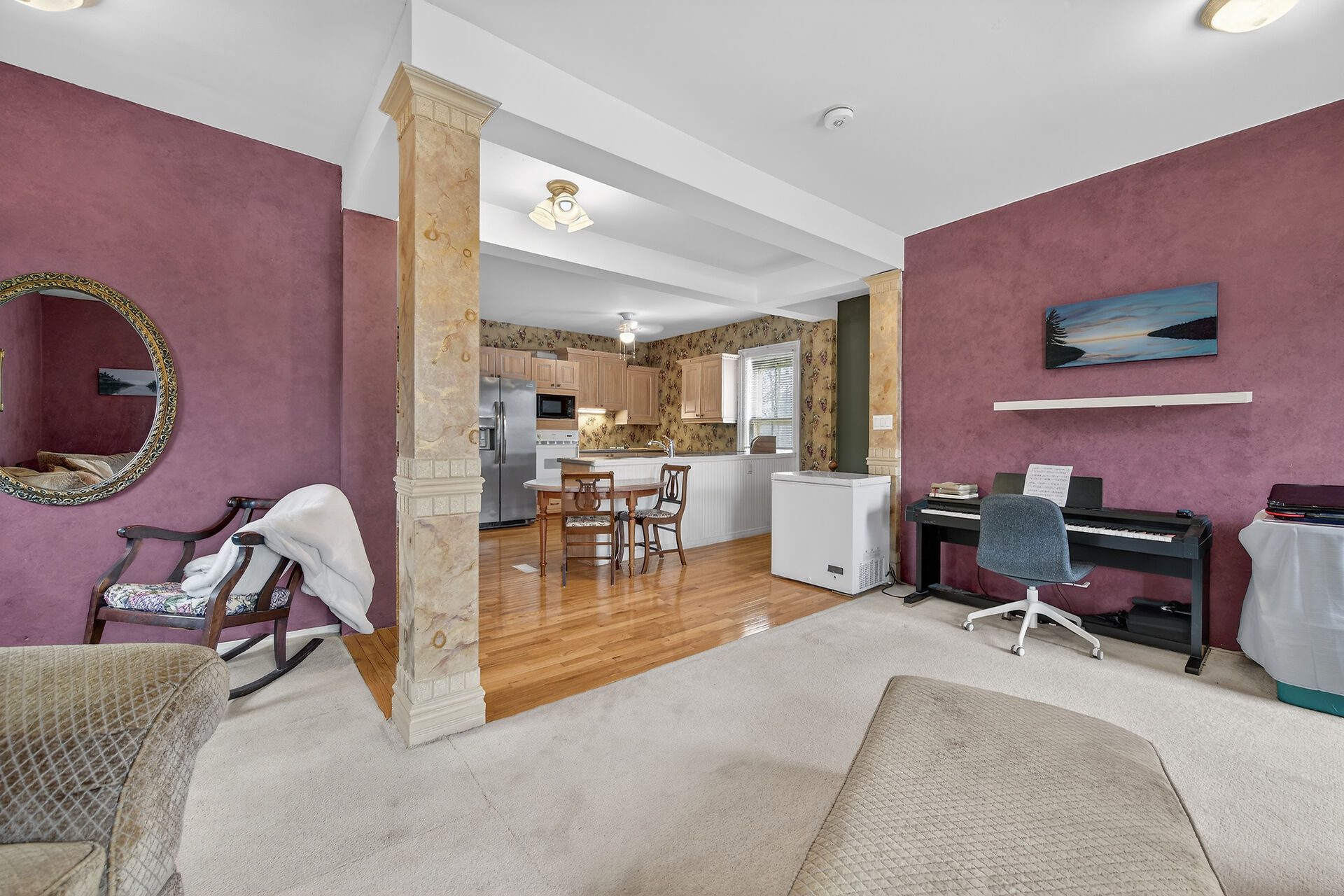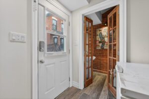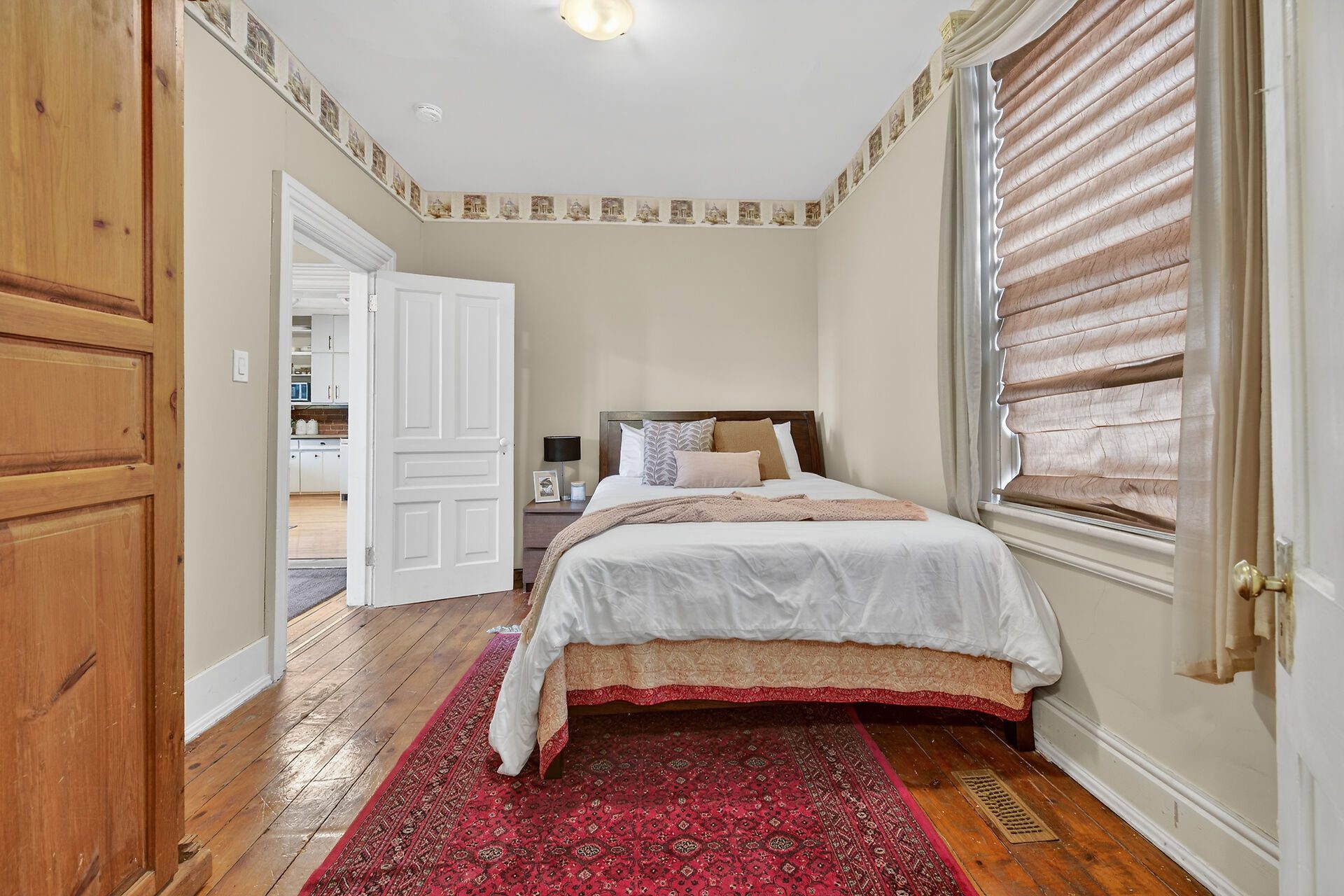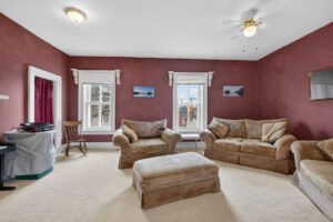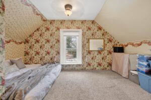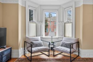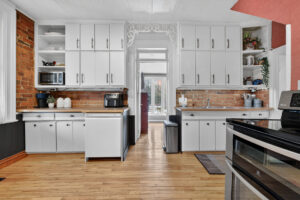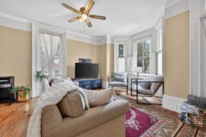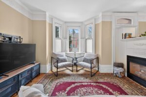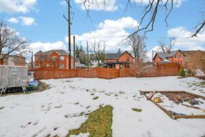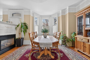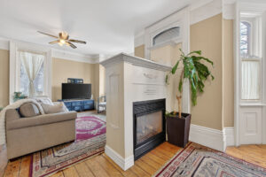This spacious property features large principal rooms and tall ceilings and windows. The main level offers a generous eat-in kitchen, formal dining room, and living room with a double-sided gas fireplace and two impressive bay windows that bring in plenty of natural light. There’s also a bedroom with a 4-piece ensuite, a large second bedroom, mudroom with side entrance, and a 2-piece bath. The laundry servicing the main floor is located in the unfinished basement.