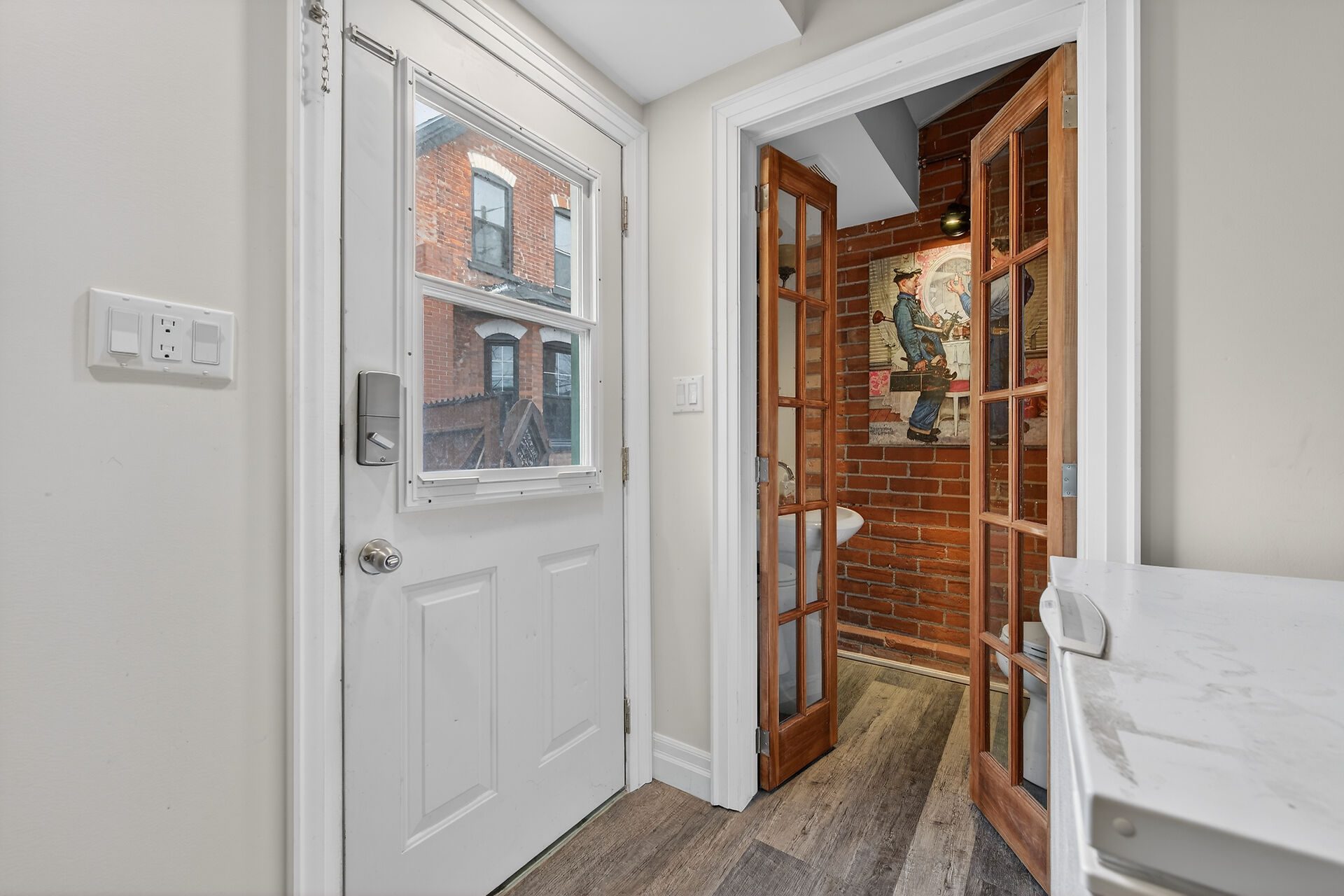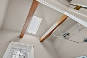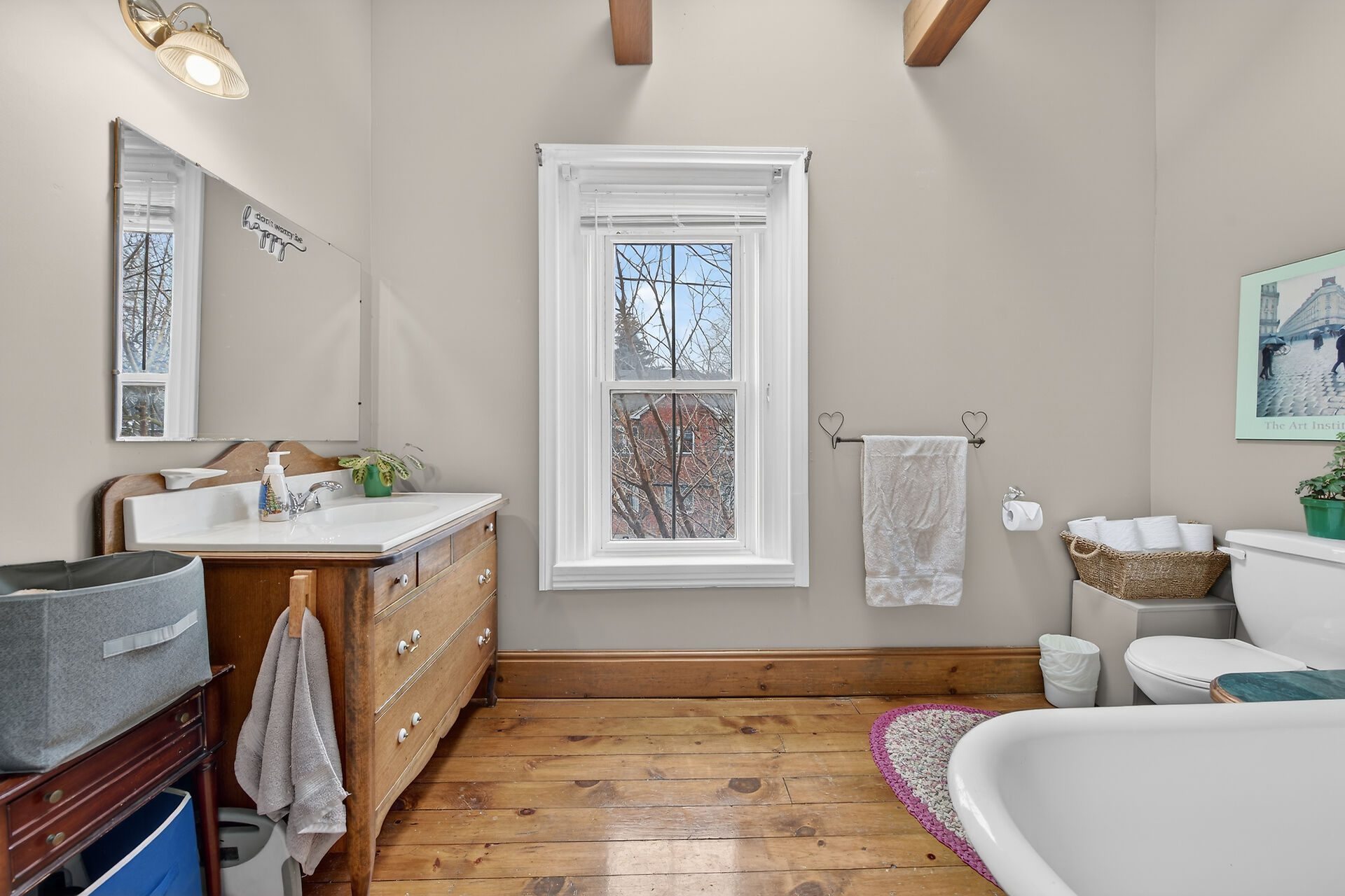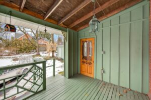 The second floor has its own separate entrance and functions as a self-contained in-law suite. It includes a spacious living/dining area with walk-out to a balcony, an eat-in kitchen with ample cabinetry, a large bedroom, and a 4-piece bath with vaulted ceiling, clawfoot tub, skylight, and exposed beams. The suite also has its own washer and dryer.