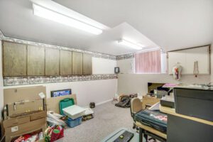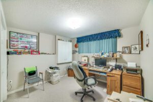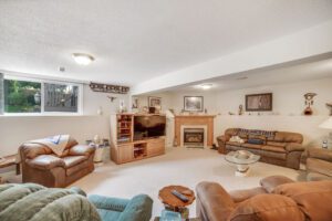 The expansive finished basement includes an open-concept family room with a gas fireplace, an additional bedroom featuring oversized egress windows, a den or hobby room, and a three-piece bathroom.