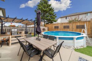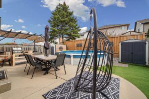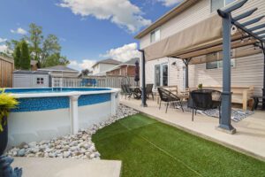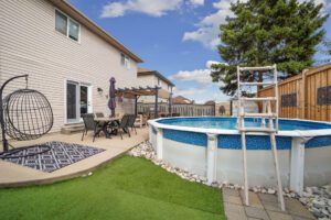 Upgrades and updates include professionally finished basement, furnace approximately 5 years old, refreshed bathrooms, refinished hardwood floors in the living room and bedrooms, pool liner approximately 5 years, eavetroughs (’24), 5ft. high crawlspace, perfect for extra storage, built-in surround sound speakers, 5 appliances, patio furniture, sub panel in garage, beautifully finished laundry room, concrete walkway to the backyard just to name a few.