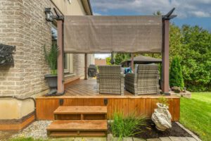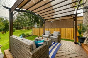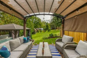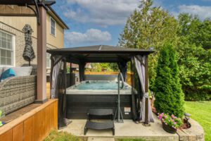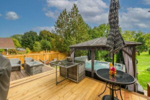 The multi-level deck features several seating areas, a pergola, a gazebo, and an 8-seater hot tub.