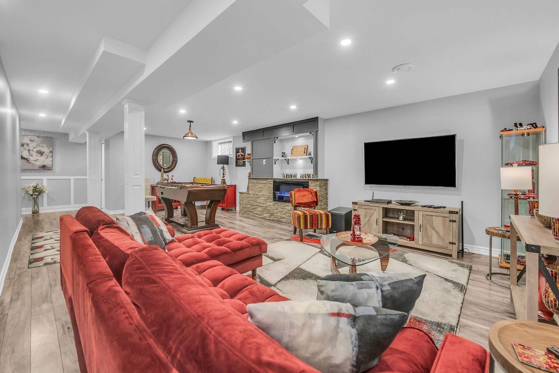 The recently completed basement offers loads of ample living space featuring a large rec-room, luxurious 3-piece bathroom and a generous sized bedroom.