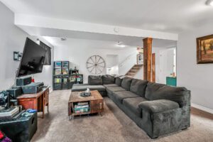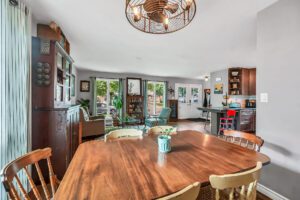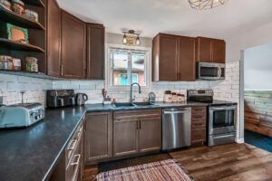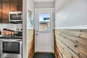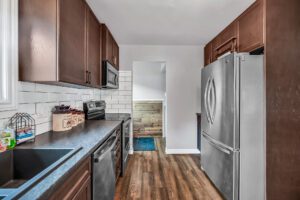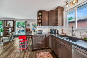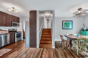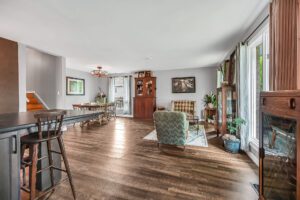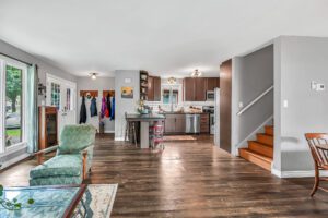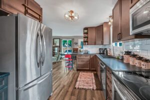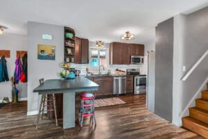 Step through newer double front doors into a spacious foyer featuring a barn board accent wall and stylish wall hooks—setting the tone for the thoughtful design throughout. The open-concept main floor boasts continuous laminate flooring, oversized windows for plenty of natural light, updated lighting, a spacious living and dining area, and a stunning kitchen renovated in 2020. Highlights include a large eat-at peninsula, soft-close cabinetry, white subway tile backsplash, stainless steel appliances, and a dedicated coffee bar.