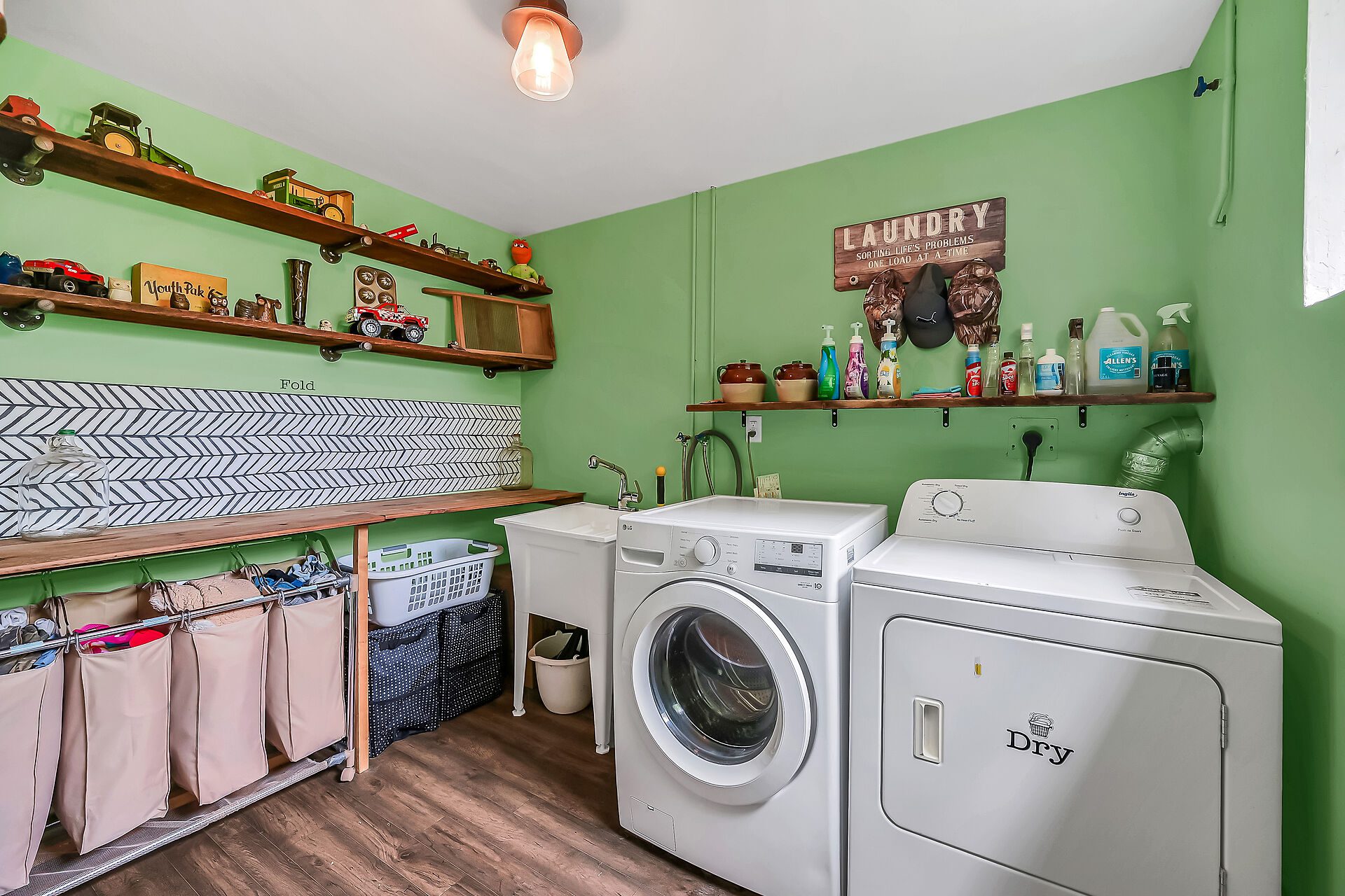 The third level offers a bright and inviting family room with above-grade windows and a cozy wood-burning fireplace, along with an updated 2-piece bathroom and a laundry room with sink and storage. The basement features a large unfinished storage room with built-in shelving, a utility room, and a bonus room currently used as a bedroom.