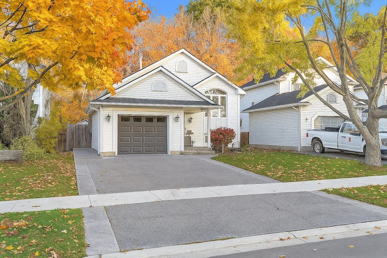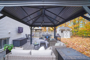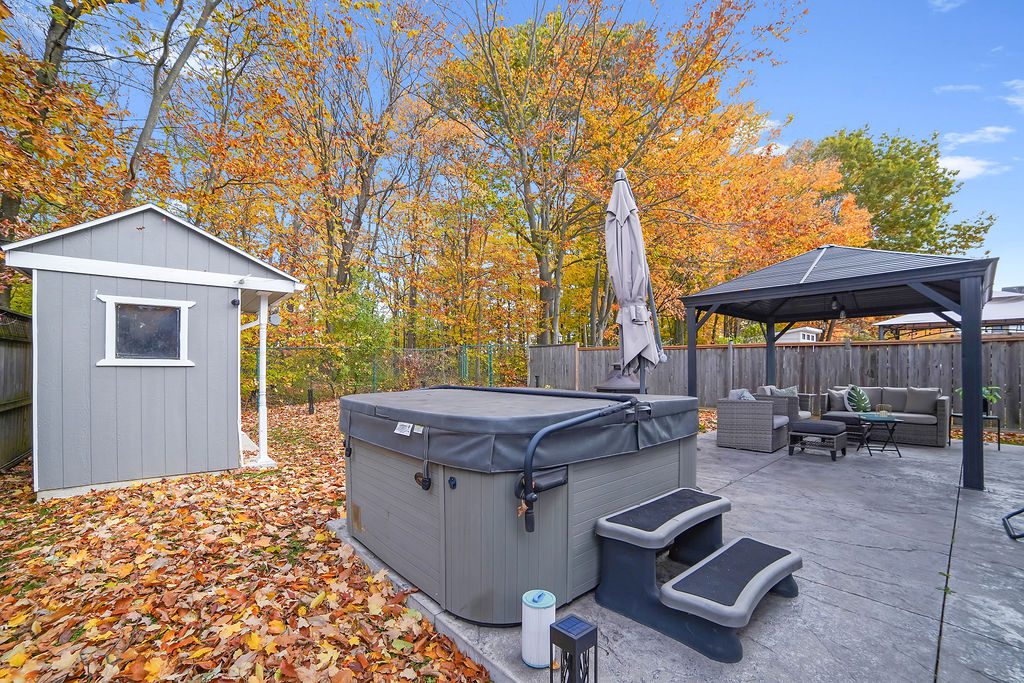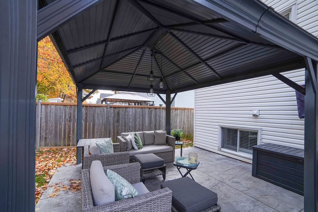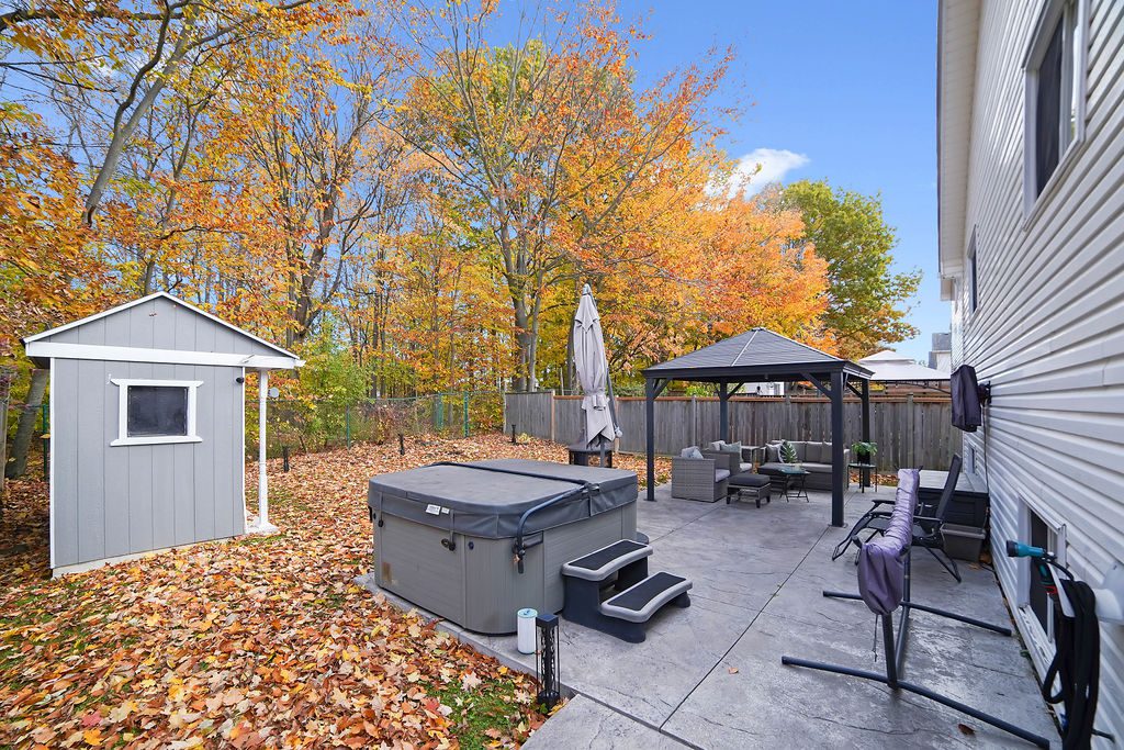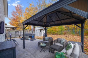 Outside, the property has been meticulously landscaped, offering a concrete driveway, walkway to the rear, and a large patterned concrete patio featuring a gazebo and hot tub. The private backyard overlooks a wooded area, creating a rare and tranquil setting.