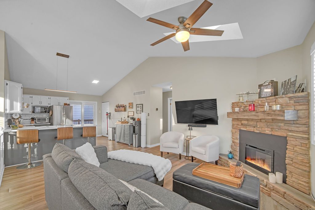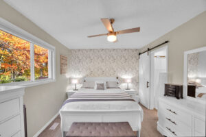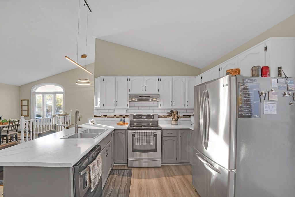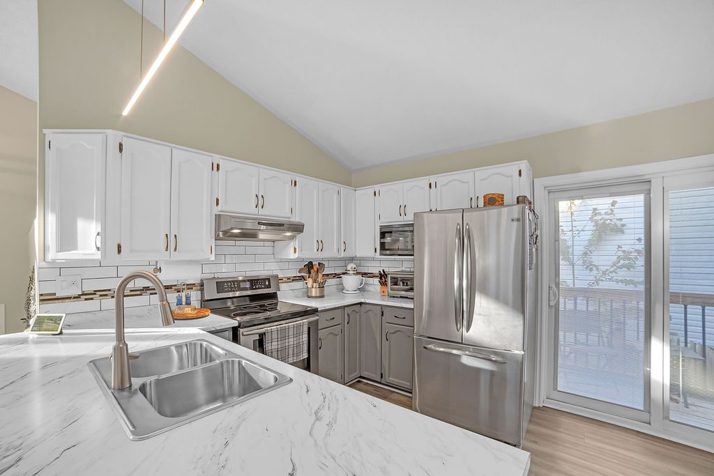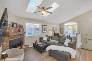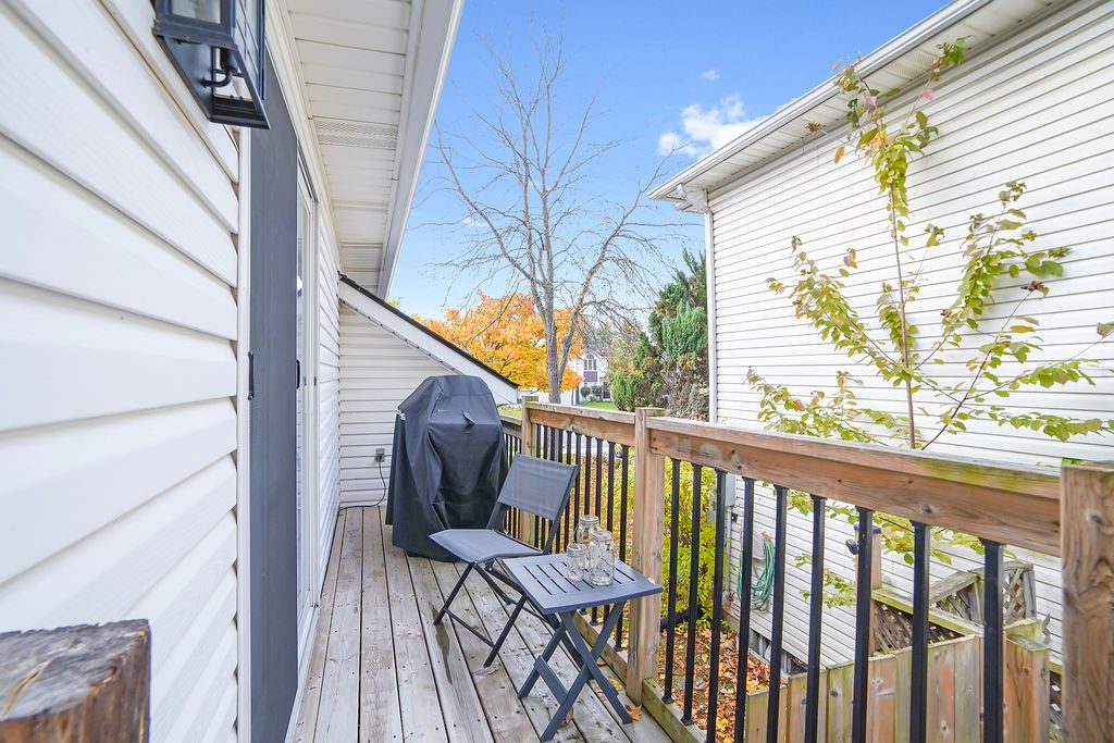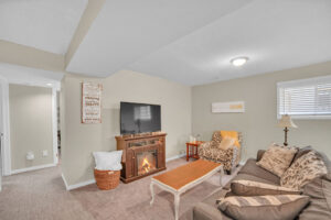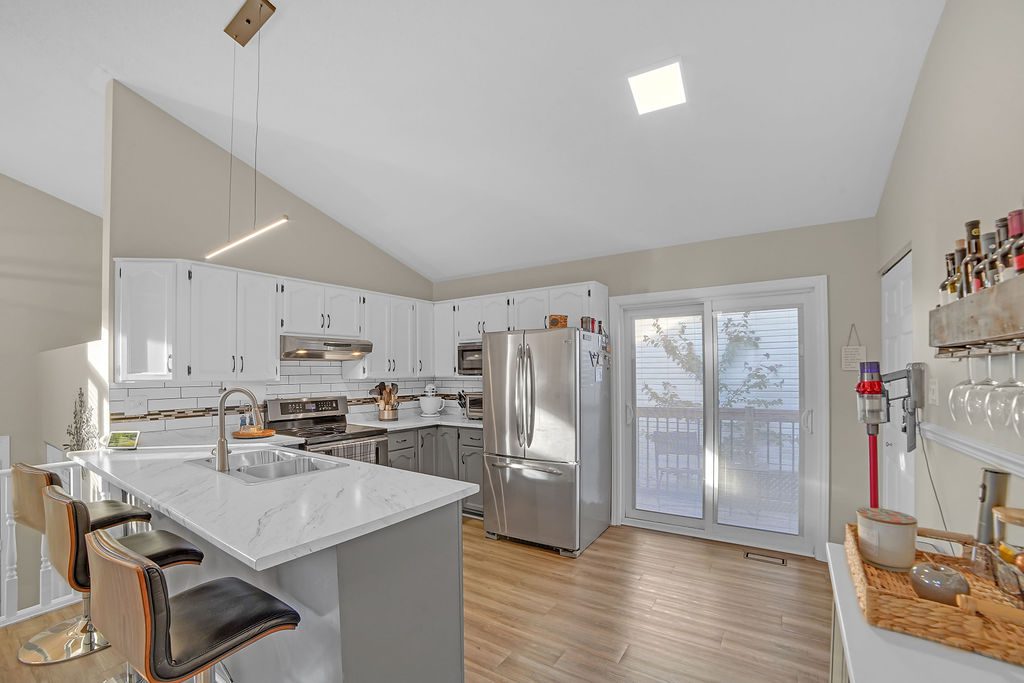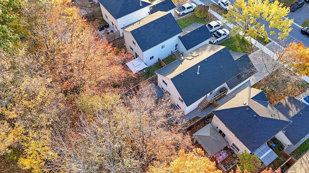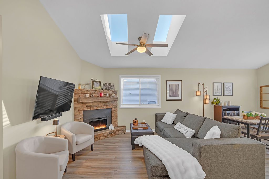 The property boasts a contemporary open-concept layout with cathedral ceilings and a cozy electric fireplace that enhances the home’s warm ambiance. The kitchen features stainless steel appliances and recently updated patio doors leading to the side deck, which includes a natural gas BBQ hookup. The main level offers two bedrooms overlooking the serene, forested area at the back of the home, as well as a recently renovated, modern four-piece bathroom.