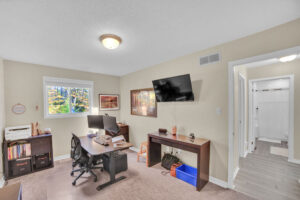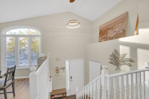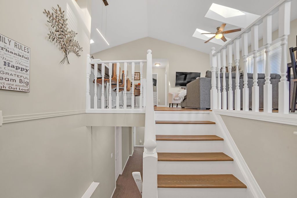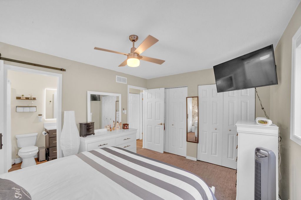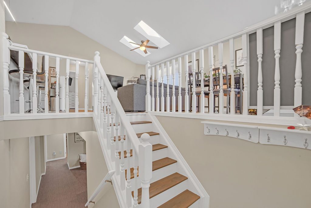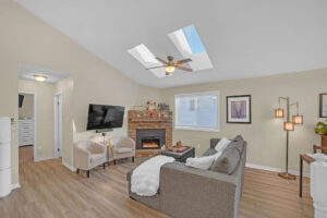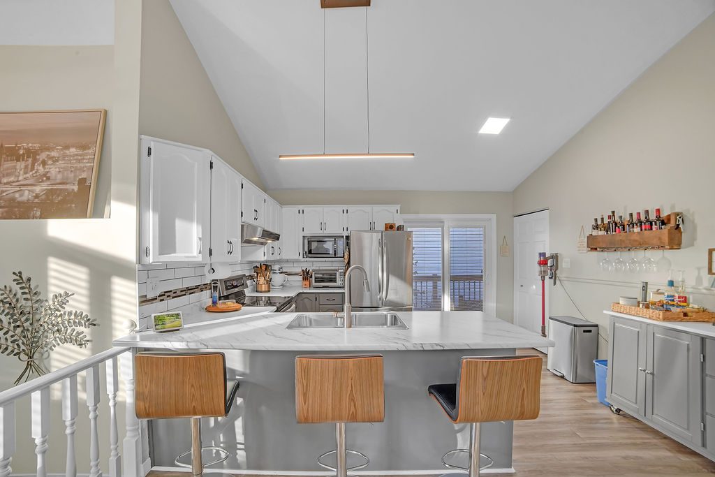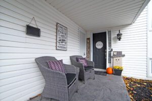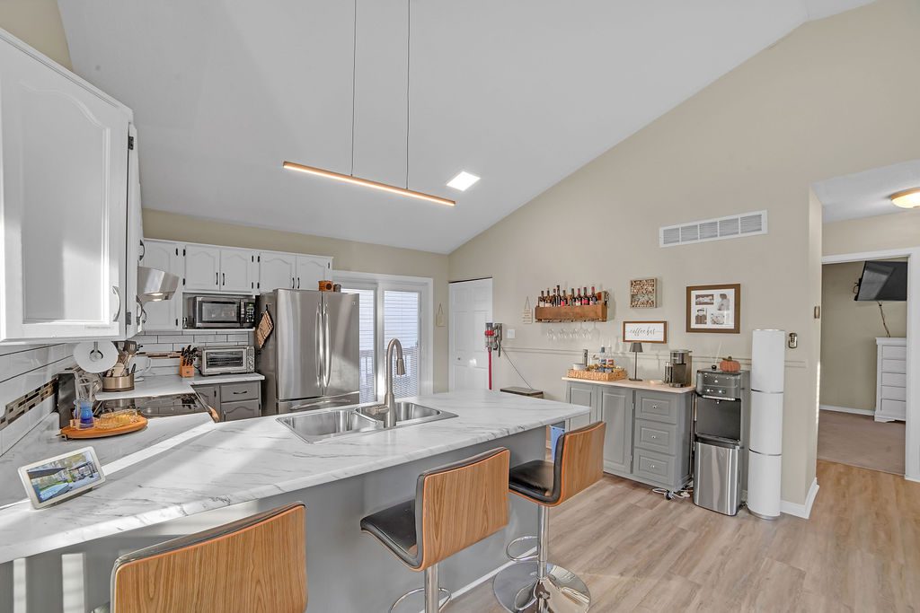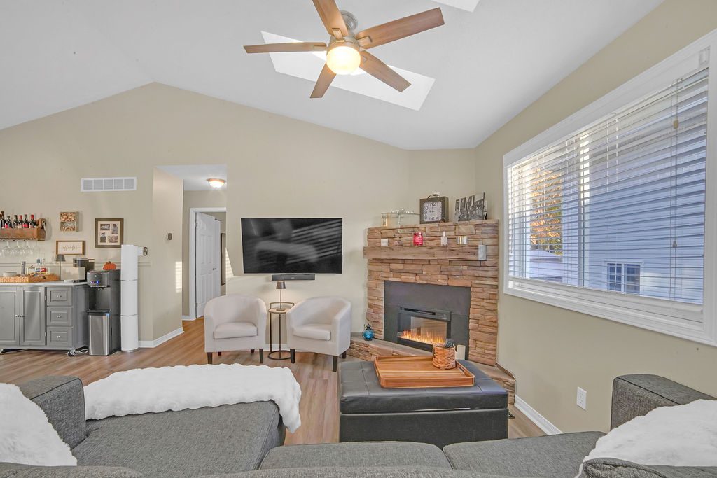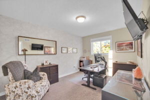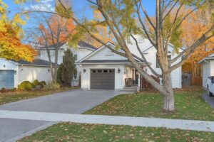 The property boasts a contemporary open-concept layout with cathedral ceilings and a cozy electric fireplace that enhances the home’s warm ambiance. The kitchen features stainless steel appliances and recently updated patio doors leading to the side deck, which includes a natural gas BBQ hookup. The main level offers two bedrooms overlooking the serene, forested area at the back of the home, as well as a recently renovated, modern four-piece bathroom.