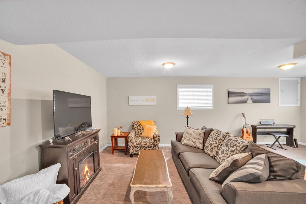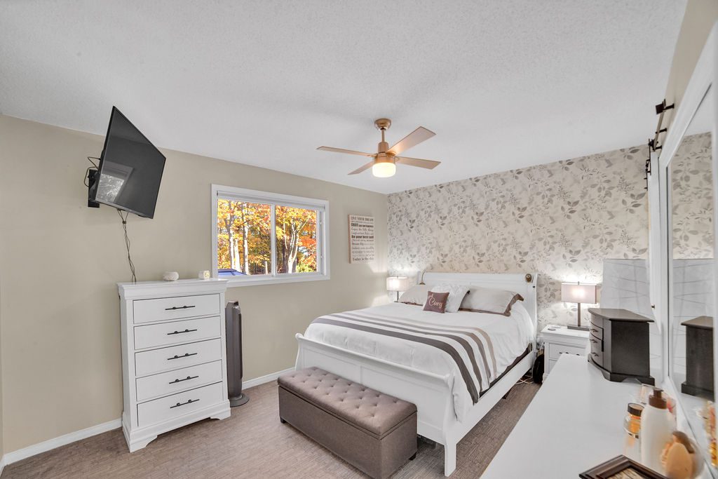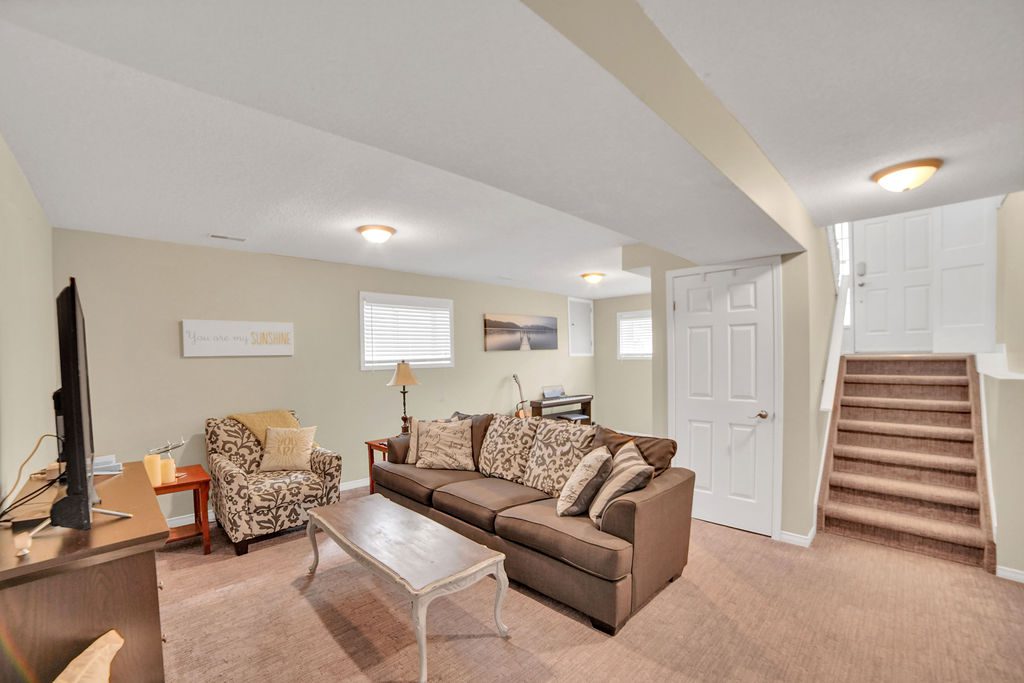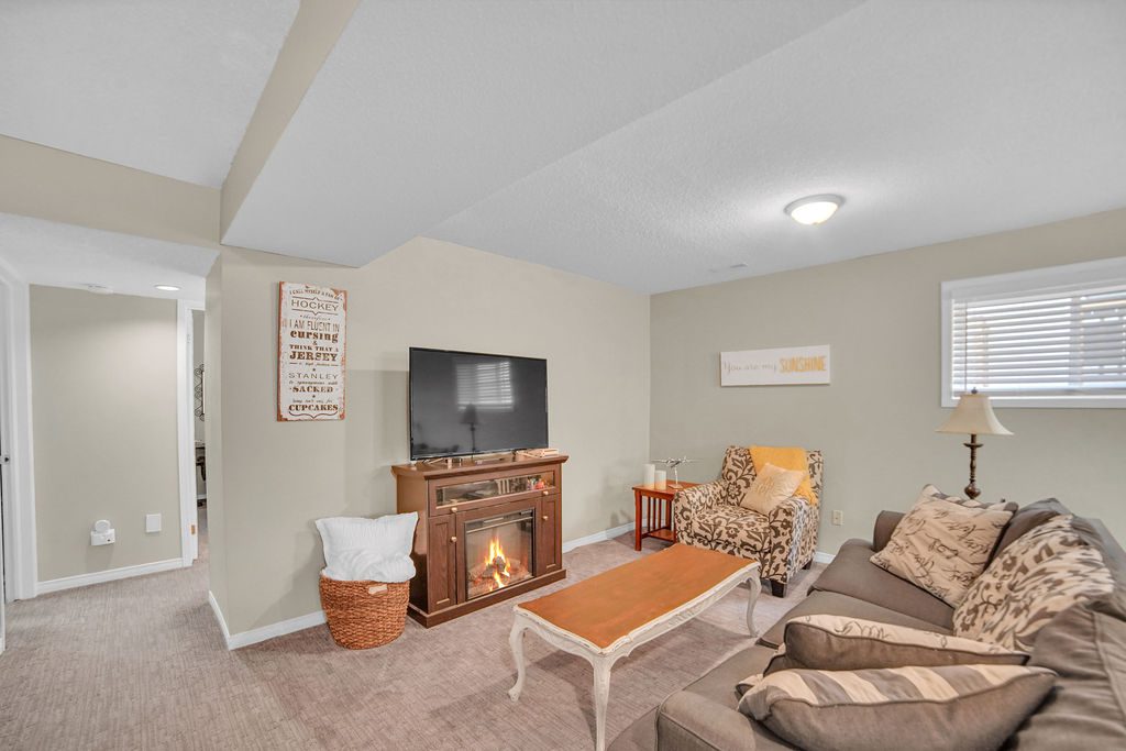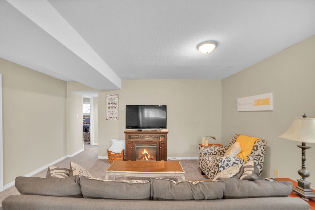 The lower level provides additional living space, including a spacious recreation room filled with natural light from large windows. Two generously-sized bedrooms and a modern three-piece bathroom with a glass walk-in shower are also located on this level.