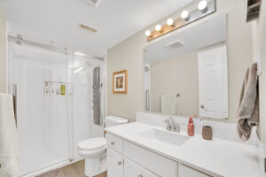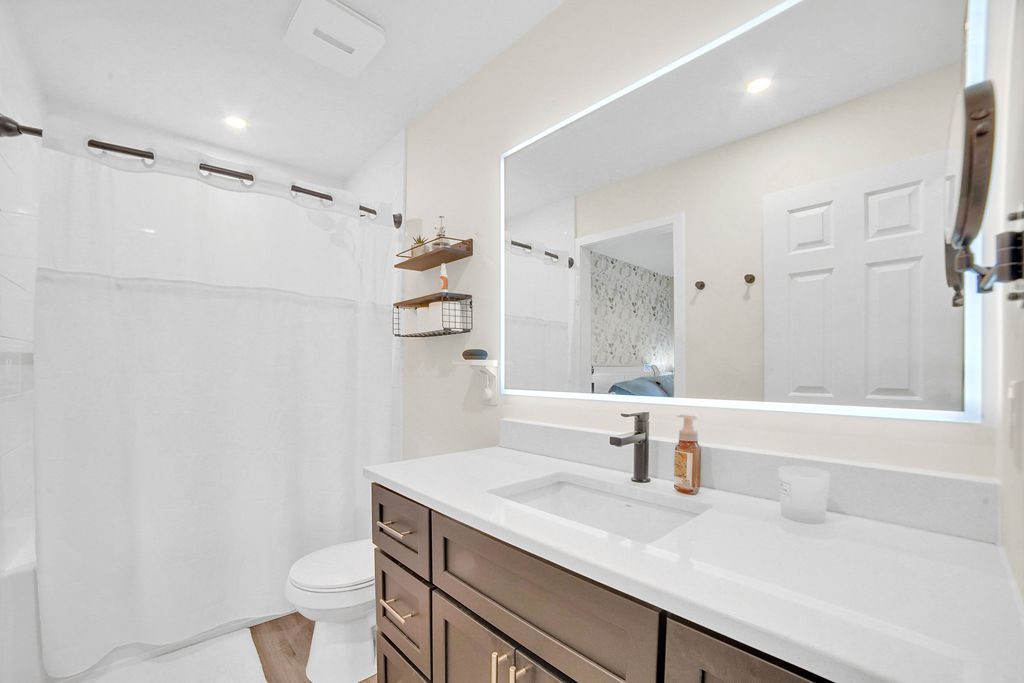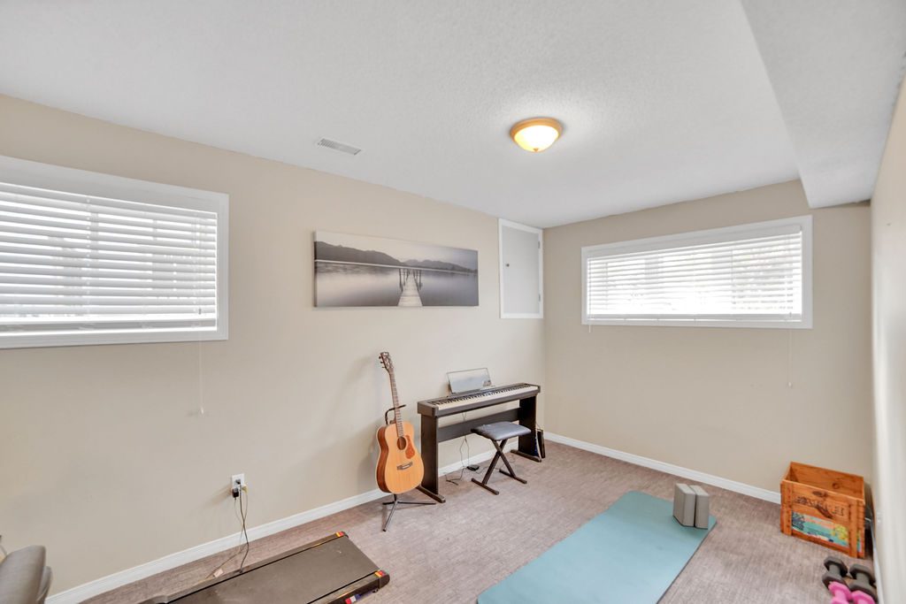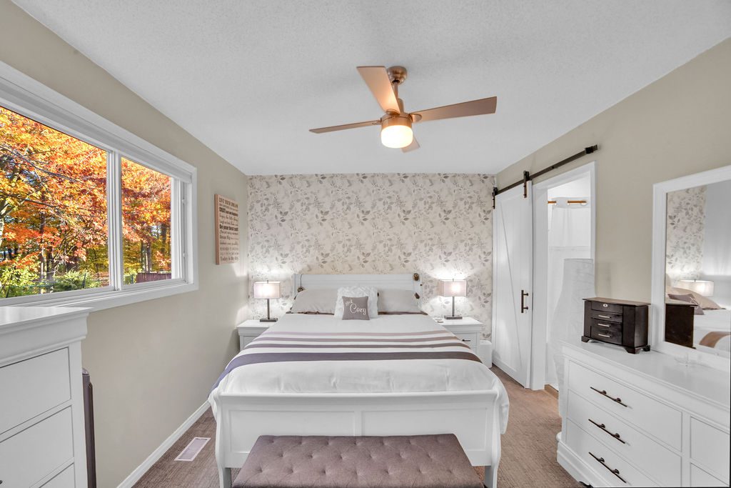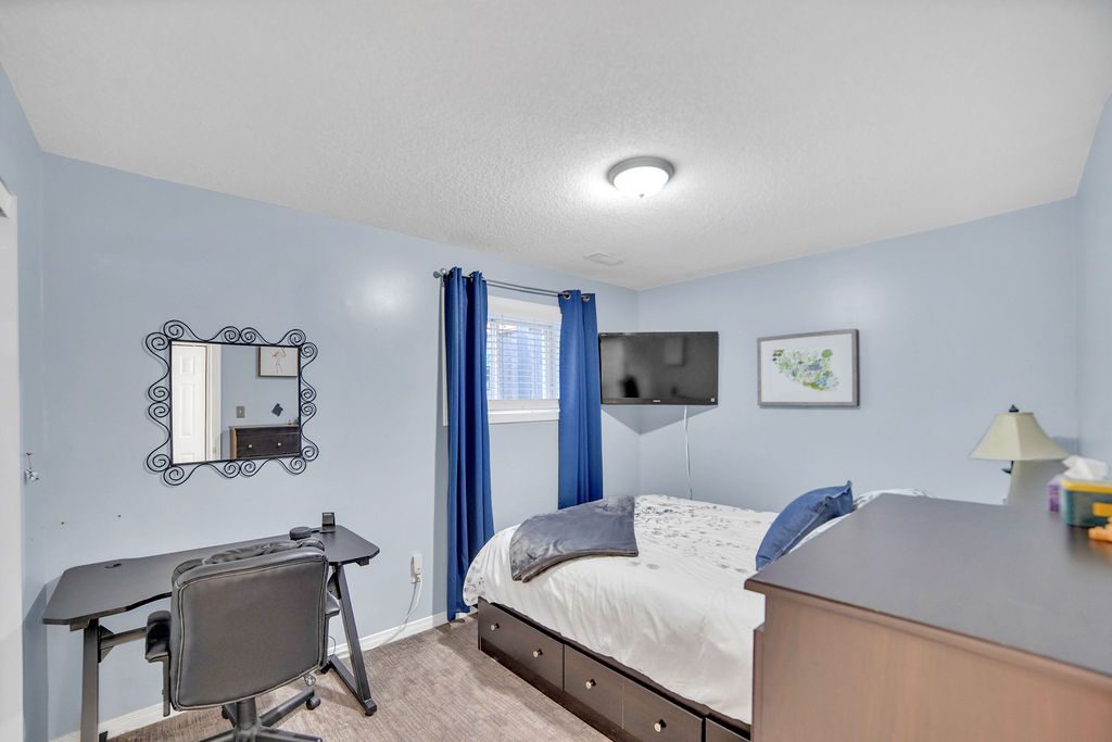 The lower level provides additional living space, including a spacious recreation room filled with natural light from large windows. Two generously-sized bedrooms and a modern three-piece bathroom with a glass walk-in shower are also located on this level.